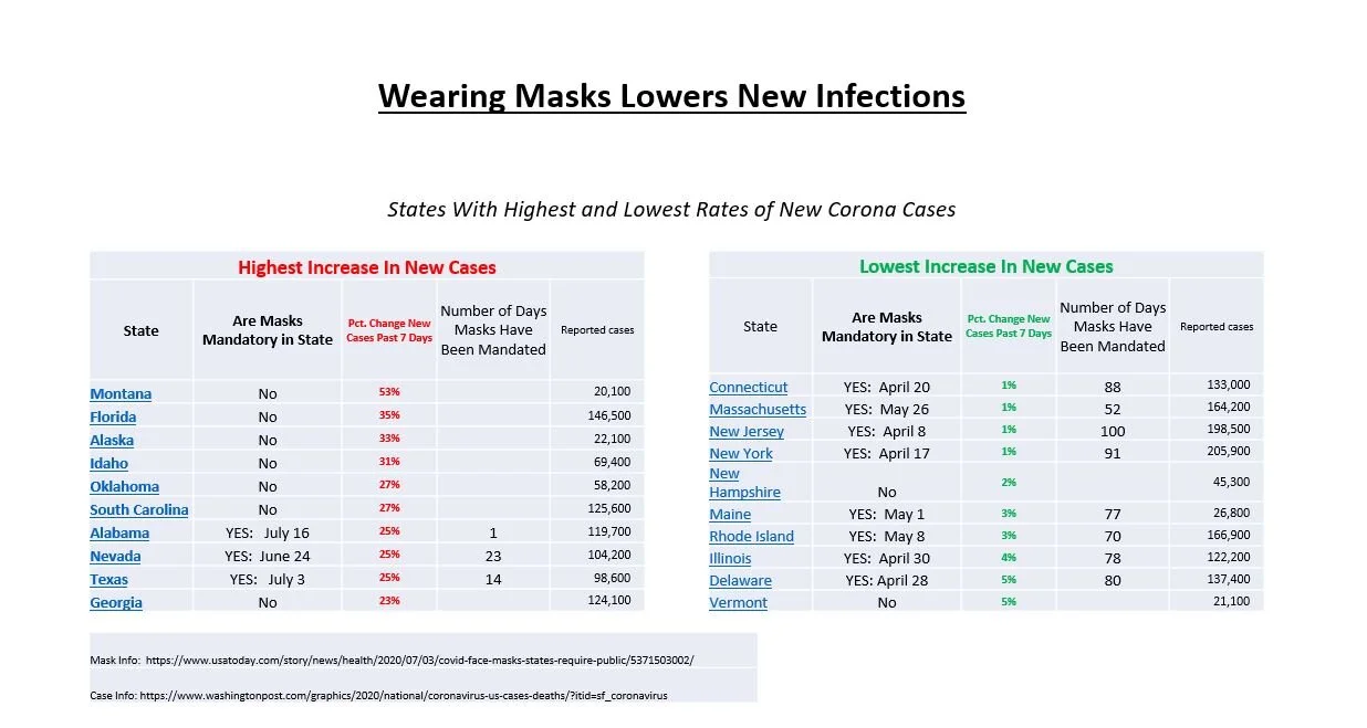 Wearing masks reduces new infections and saves lives. Take a look at how much faster Covid is spreading in states that do not require masks. As of July 16th, of states where new infections are increasing the fastest, only 3 require masks, and those three states only recently required masks. In Montana, Florida and Georgia, new cases are up 53%, 35% and 23% respectively